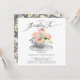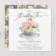 Schönes rosa Blumenstrauß in einem grauen Teetasse-Set auf grauem Hintergrund für ein Party zum Geburtstag. Dreh unsere Einladung zu einem koordinierenden Blumenbacken für eine besondere Touch.
