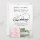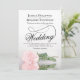 Diese wunderschöne Hochzeitseinladung zeigt ein wunderschönes Foto eines Single, der sich auf der Seite einer rosafarbenen Rose befindet und in einem Wasserbecken mit Wellen und Wellen reflektiert. Das Design verfügt über ein extravagantes Kalligraphieskript mit einem langen, lockigen Schwanz, was es sowohl modern als auch klassisch macht. Elegante, raffinierte und schicke Art und Weise, Ihre Freunde und Familie zu einem besonderen Tag einzuladen. Die Rückseite der Karte ist eine hellrot-rosa Farbe mit einem weichen Muster.