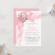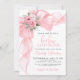 Diese süße rosa Schleifen-Baby-Shower-Einladung zeigt eine weiche rosa Wasserfarben-Schleife mit fließenden Bändern entlang der oberen und linken Kanten für einen süßen, spielerischen Look. In der Mitte der Schleife sitzt ein zartes Bündel rosa Rosen und weiche florale Akzente, die einen romantischen und eleganten Touch hinzufügen, der das Design schön ergänzt. Oben auf der Einladung steht "Baby Shower" in einer charmanten Mischung aus Schreib- und Serifenschriftarten, die einen modernen, aber süßen und grazilen Ton setzt. Die restlichen Details halten das Layout leicht, feminin und lustig.