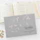 Elegantes Hochzeitsguestbook. Hellgrauer Hintergrund mit pastellrot-rosa Rebdesign. Ideal für jede Hochzeit. Personalisieren Sie diese wunderschönen Gästebücher, indem Sie die Namen von Braut und Bräutigam mit dem Hochzeitstag hinzufügen. Kontaktieren Sie den Designer für weitere Variationen.