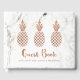 Dieses stilvolle Gästebuch zeigt Ananas im Rose-Gold-Look (nicht Goldfolie) auf weißem Marmor-Hintergrund. Das Buch sagt "Gästebuch" in trendiger Typografie, und hat einen Platz für Sie, um den Titel Ihrer Veranstaltung hinzuzufügen.