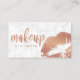 Stilvolles und modernes Make-up-Visitenkartendesign mit Imitaten aus Kupfer-Rose, goldenen Schminktexten und Lippen, weißer Marmorstruktur.