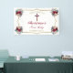 Feiern Sie die Freude an der Ersten Heiligen Kommunion Ihrer rote Rose, wenn Sie die Gäste im 1. Heiligen Kommunion Empfang Ihrer Tochter mit diesem wunderschönen Blumenbanner der 1. Heiligen Kommunion begrüßen. Dieses schicke Begrüßungsbanner für die heilige Gemeinschaft eines Mädchens weist einen großen Goldrahmen mit einem schönen Holzkreuz auf, das ein rosa und rosa Rosenbouquet hat. In jeder Ecke sind die Rose rot und cremefarben. Personalisieren Sie Ihre persönlichen Daten mit dem Vornamen Ihrer Tochter.