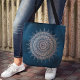 Wunderschöne kreisförmige mandala Kunsttasche in leuchtender Rose goldgelb auf tiefem aquamarinem Hintergrund, inspiriert von mehndi henna Körperkunst.