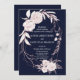 Elegante Rose Gold Weiße Blume Geometrisches Hochzeitsdesign. Es verfügt über elegante Imitate Rose goldweiße Blume, Rose goldene geometrische Rahmen, Rose Gold Blumenteiler auf der Rückseite, alle auf einem dunkelblauen Hintergrund. Verwenden Sie das Tool Personalize, um Ihre Informationen hinzuzufügen, um die Hintergrundfarbe zu ändern. Für passende Artikel, besuchen Sie bitte meine Rose Gold White Blume Collection.