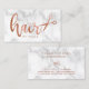 Moderne Visitenkarte für Friseure oder Friseursalon mit Imitaten Kupfer-Rose Goldschere, kalligraphischer Schriftart und weißem Marmorhintergrund.