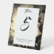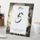 Die Design-Front zeichnet sich durch ein großes Bild einer schönen sepia-Rose vor einem schwarzen Hintergrund aus. Die Namen der Ehepaare werden in einem eleganten Schriftart auf einem rechteckigen, weißen Untergrund dargestellt. Unter Überschrift steht "Tabelle" über der Zahl, die fett dargestellt wird. Unten zeigt die Namen der Braut und des Bräutigams zusammen mit dem Datum der Hochzeit. Konzipiert, um sich mit der katholischen Hochzeitssuite Eleganter Rose abzustimmen.