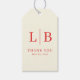 Dieses Hochzeitsdankeschön-Tag hat ein minimalistisches Design mit einem hellbeigen Hintergrund, das einen eleganten und modernen Look schafft. Die fette rote vertikale Linie trennt die Initialen "L" und "B", die in einer klassischen Serifenschrift gedruckt sind, während die Worte "DANKE" darunter in einer leichteren Schriftstärke derselben Typeface angezeigt werden. Der Gesamtstil ist sauber und anspruchsvoll, perfekt, um sich bei Ihrem besonderen Ereignis zu bedanken. Seine einfache Komposition und die weiche Farbpalette machen es ideal, um jeder Feier einen Hauch von Raffinesse zu verleihen.