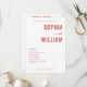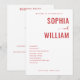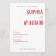 Dieses Hochzeitsprogramm verfügt über ein minimalistisches und elegantes Design mit einem weichen, cremefarbenen Hintergrund. Das Layout ist um die fetten roten Serif-Schriftarten für die Namen "SOPHIA" und "WILLIAM" zentriert, die durch ein zartes kursives "und" getrennt sind. Die Details zur Trauung sind in einer sauberen serifenlosen Schrift ordentlich aufgelistet, wodurch eine anspruchsvolle und formelle Atmosphäre erhalten bleibt. Die Farbpalette aus gedämpften Rottönen und neutralen Farben verbessert die Lesbarkeit und lenkt die Aufmerksamkeit auf die wesentlichen Informationen, wodurch sie perfekt für eine stilvolle und moderne Hochzeitsfeier ist.