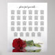 Dieses wunderschöne Hochzeitssitzdiagramm zeigt ein Foto einer langen rote Rose, die auf der Seite liegt und in einem Wasserbecken mit Wellen und Wellen reflektiert wird. Der Titel lautet "Bitte finden Sie Ihren Tisch" in eleganter Schnappschreiber-Kalligrafie. Nachstehend finden Sie Platz für die Namen der Paare und das Hochzeitsdatum. Dieses Diagramm bietet Platz für 290 Gäste in einer traditionellen Anordnung von 10 Personen pro Tisch.