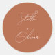 Elegante weiße Skriptkalligraphie von Braut- und Ziernamen auf rustikalen Terrakotta Rundaufkleber.