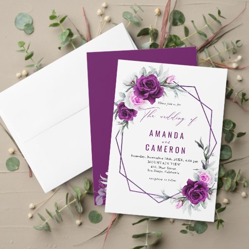 Diese Einladungen vereinen rustikalen Charme mit moderner Eleganz, perfekt für eine anspruchsvolle und natürliche Hochzeitsfeier. Das Design besticht durch eine wunderschöne Farbpalette mit lila und sanften Farbtönen und eine beeindruckende geometrische Rautenform, die eine moderne Touch verleiht. Die zarten Blumenakzente, kombiniert mit dem einzigartigen Vellum-Overlay, schaffen einen überlagerten, ätherischen Look. Ideal für Paare, die eine einzigartige Einladung suchen, die rustikale Wärme mit modernem Design und luxuriösen Details in Einklang bringt.