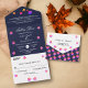 Diese elegante Hochzeit im Herbst lädt zu einer modernen Herbsthochzeit ein. Das schlichte Design zeichnet sich durch neonfarbene Herbstlaube mit eleganter weißer Typografie auf marineblau-blauem Hintergrund aus.