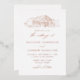 Rustikale Hochzeitseinladungen mit einer skizzierten Rose Goldfolie-Illustration einer Scheune oben auf der Einladung auf einem weißen Hintergrund. Die Einladungen der Scheune sind mit eleganten Rose-Goldfolien-Kalligrafieelementen im gesamten Design gestaltet. Personalisieren Sie die Rose Goldfolie Scheune Hochzeit lädt mit Ihren Namen und Hochzeitsdetails.