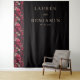Dies ist ein Bild im stilvollen Stil mit einer eleganten Hochzeitseinladung vor einem auffälligen schwarzen Hintergrund. Die linke Seite zeigt einen lebendigen Rand aus roten Schädeln, die mit komplizierten Blumenmustern in Rot-, Gold- und Grüntönen verflochten sind. Die Namen "Lauren und Benjamin" werden in klassischer Serifenschrift prominent dargestellt, gefolgt von dem Datum "23. Mai 2026", was einen Hauch zeitloser Eleganz verleiht. Das Design kombiniert makabren Charme mit romantischer Raffinesse und ist somit perfekt für Paare, die eine einzigartige und kühne Ästhetik schätzen.