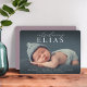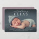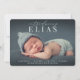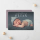 Ein elegantes Geburt-Ankündigungsdesign mit einem vollblutenden, horizontalen oder landschaftsorientierten Foto mit der "Einführung [Name]" an der Spitze in der schicken weißen Kalligraphie-Schrift und klassischer Serifenschrift. Der vollständige Name Ihres Babys, die Geburtsdaten und die Unterschrift Ihrer Familie erscheinen ganz unten. Fügen Sie drei zusätzliche quadratische Fotos auf der Rückseite hinzu.