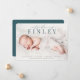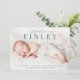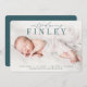 Ein elegantes Geburt-Ankündigungsdesign mit einem vollblutenden, horizontalen oder landschaftsorientierten Foto mit der "Einführung [Name]" an der Spitze in chic kalligraphischer Schrift und klassischer Serifenschrift. Der vollständige Name Ihres Babys, die Geburtsdaten und die Unterschrift Ihrer Familie erscheinen ganz unten. Fügen Sie drei zusätzliche quadratische Fotos auf der Rückseite hinzu.
