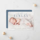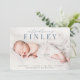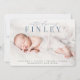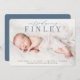 Ein elegantes Geburt-Ankündigungsdesign mit einem vollblutenden, horizontalen oder landschaftsorientierten Foto mit der "Einführung [Name]" an der Spitze in chic kalligraphischer Schrift und klassischer Serifenschrift. Der vollständige Name Ihres Babys, die Geburtsdaten und die Unterschrift Ihrer Familie erscheinen ganz unten. Fügen Sie drei zusätzliche quadratische Fotos auf der Rückseite hinzu.