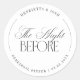 Dieser elegante runde Aufkleber „The Night Before“ verfügt über eine verfeinerte klassische Typografie mit einem dezenten runden Rahmen und einem sauberen monochromen Layout. Die Mischung aus Serifenschrift und weicher Schreibschrift verleiht ihm ein zeitloses, zurückhaltendes Aussehen, das perfekt zum Verschließen von Umschlägen, Geschenkschachteln oder Verpackungen mit einer einfachen, eleganten Note geeignet ist. Der Aufkleber wurde für Veranstaltungen mit einer minimalistischen, klassischen Ästhetik entworfen und passt wunderbar zu modernen oder traditionellen Dekorationen.