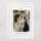 Diese elegante Black and White Wedding Dankeschön Card ist einfach und vielseitig. Es zeichnet sich durch ein elegantes Schwarz-Weiß-Design mit einem Monogramm, einem senkrechten Foto, einem einfachen Goldrahmen und einem minimalen bearbeitbaren Danke und Namen auf der Vorderseite aus. Die Rückseite hat ein zweites horizontales Foto mit einer bearbeitbaren persönlichen Nachricht und Skriptsignatur. Klicken Sie auf die Schaltfläche Bearbeiten, um dieses Design anzupassen.