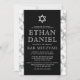 Elegante, moderne Bar mitzvah-Einladungen mit weißen Marmorrahmen und Ihrem Einladungstext in der Mitte auf schwarzem Hintergrund mit einem weißen David-Stern an der Spitze. Weitere Produkte, Kundenanfragen, Verkäufe, News und mehr finden Sie auf Facebook: @chaistationery
