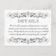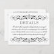 Benutzerdefinierte Details-Karte in Schwarz-Weiß-Farben mit eleganten Vintagen blüh-Details. Umfasst Informationen für einen Hochzeitsempfang für Erwachsene auf der Vorderseite mit zusätzlichen Informationen für Hotelunterkünfte, Registrierung und Hochzeitswebsite auf der Rückseite. Kartenformulierung und Farbgebung und vollständig personalisiert sein.