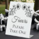 Mit diesem atemberaubenden Tafelschild der Gastgeschenk Hochzeit empfangen Sie Ihre Gäste mit Eleganz und Charme. Dieses Schild eignet sich ideal für minimalistische Hochzeiten oder rustikale Feste auf dem Land, die mit einer delikaten Anordnung von Sonnenblumen und Wildblumen in Schwarz und Weiß. Das extravagante Skript fügt eine Touch von Raffinesse hinzu, während der leicht zu lesende Schriftart sicherstellt, dass Ihre Nachricht - "Bitte nehmen Sie eins" - klar und einladend ist. Dieses botanisch inspirierte Schild eignet sich ideal für Sommer-, Frühlings- und Herbstgarten-Party und fügt sich wunderbar in jedes Hochzeitsdekor ein. Mit diesem zeitlosen, eleganten Zusatz können Sie Ihren Gaumen stärken und jedem Gast ein Gefühl von Wertschätzung geben.
