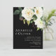Eine elegante blumengeschmückte Hochzeitseinladung mit einer Aquarellanordnung aus weißen Blumen und einer Mischung aus Grünpflanzen auf einer schwarzen Karte. Personalisieren Sie alle wichtigen Details, einschließlich Brautname und Bräutigam, Hochzeitstag und Ort. Die Rückseite ist schwarz koordiniert