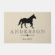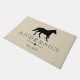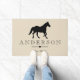Elegante schwarze PferdeSilhouette in der Mitte. Tge Hintergrund hat ein sehr kleines Weiß ausgebogtes Muster über Taupe und personalisiertem Familiennametext. Diese Fußmatte scheidet Verfeinerung aus und würde einen großen Eindruck auf Ihren Hausgästen machen, während sie zu Ihrem Zuhause begrüßt werden!
