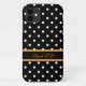 Elegante schwarz-weiße Polka-Punkte mit gelben Farbstreifen und vollem Namen. Wählen Sie einen anderen Telefonstil, klicken Sie auf den gelben CUSTOMIZE und wählen Sie aus dem Drop-Down-Menü aus iPhone 3S, 4S, 5S; Samsung Galaxy S2, S3, Nexus; iPod Touch; HTV Vivid; Motorola Razr; Blackberry Bold 9700/9780.