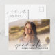 Elegante Abschlussfeier Einladung Postkarte mit dem Foto des Absolventen überlagert mit "Absolvent" in einer modernen Drehbuch und ihren Namen und Klasse Jahr in einfachen Typografie. Auf der Rückseite fügen Sie die Details der Graduierungsparty hinzu.