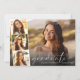 Elegante und moderne Ankündigung und Party Einladung des Abschlusses mit dem Foto des Absolventen überlagert mit einem Streifen von drei kleineren quadratischen Fotos, "danke" in einem schicken, dünnen weißen Drehbuch, und ihren Namen und Klasse Jahr in der einfachen weißen Typografie. Auf der Rückseite fügen Sie die Details der Graduierungsparty hinzu.