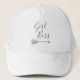 Ein schlichter weißer LKW-Hut mit einem grauen Pfeil unten, wo oben, dass Sie es mit einem Logo, Namen oder Buchstaben personalisieren können oder einfach behalten, wie es mit der Phrase "Girl Boss". Modernes mädchenhaftes Thema.