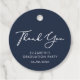 Elegante blaue Graduiertenparty bevorzugt Tags mit "Danke" in einem schicken weißen Drehbuch und dem Graduiertendatum und Party in modernen weißen Schriften.