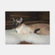 Die siamesische Katze des Siegel-Punktes behaltend warm auf den Wollen eines des Imitats weißen Lamms werfen Decke auf der Couch. Sie legt also hübsch mit ihrem gekräuselten Schwanz und ihren atemberaubenden blauen Augen.