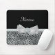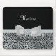 Ein elegantes Mousepad in silbergrauer Cheetah-Optik mit einem kühnen, weißen Bogen mit hübschen Perlen und einem Rosettenband in der Mitte. Jedes Mädchen, das silber und schwarz Liebe, würde Liebe haben, seinen Namen diesem schicken und stilvollen Tierdesign hinzuzufügen. Flachbild, nicht echtes Band.