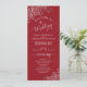 Dieses wunderschöne Hochzeitsprogramm zeichnet sich durch ein elegantes Design aus, mit weißem Text auf einem knallroten Hintergrund und silbergrauen Imitat-Folienrollen und Wirbel in den Ecken. Die Titel sind in extravaganter Skriptkalligraphie geschrieben, und es gibt Platz für Ihre Zeremonie und Hochzeitsfeier Details, sowie ein kurzes Dankeschön für Ihren Gast. Ein wunderbarer Weg, um Ihre Freunde und Familie zu Ihrer Hochzeitsfeier zu begrüßen.