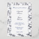 Elegantes, silbergepresstes Rokoko Muster Hochzeitsfolie Einladung. Ein elegantes silberfarbenes Rokoko-Muster und der Text in einem Rahmen. Die Braut und die Bräutigamen sind auch Silberfolie bedruckt. Der Hintergrund ist dunkelmarineblau.