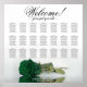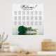 Mit diesem exquisiten 21 Tisch-Sitzplan verleihen Sie Ihrem Hochzeitsempfang eine ästhetische Note. Das Diagramm bietet Platz für bis zu 210 Gäste und folgt einer traditionellen Anordnung von 10 Plätzen pro Tisch. Das Design strahlt eine romantische und atemberaubende Aura aus und zeigt eine einsame, tiefgrüne Rose in smaragdgrünen Farben, die seitwärts ruht und sich in einem Wasserkörper spiegelt. Der elegante kalligrafische Titel lautet "Willkommen! Bitte finden Sie Ihr" mit viel Platz am Ende für die Namen des Paares und das Hochzeitsdatum. Dieses Sitzdiagramm bietet eine angenehme Begrüßung für Ihre Gäste und erleichtert die Sitzgestaltung.