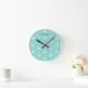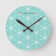 Eine elegante, moderne Wanduhr mit festlich geometrischen Mustern weißer Schneeflocken auf einem frischen, eisigen aquablauen Hintergrund. Personalisieren Sie den Namen des Empfängers als stilvolles und nützliches Urlaubsgeschenk für die Zuhause.