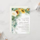 Schöne, elegante gelbe Sonnenblumen, weiße Rosen, Eukalyptus und andere Pflanzen auf einer botanisch cremefarbenen Hochzeitseinladung. Kontaktieren Sie uns für Hilfe bei der Anpassung oder der Anpassung von Produkten. Die Namen der Braut und des Bräutigams sind in einem eleganten Skript-Schriftart.
