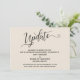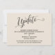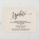 Die Besonderheit dieser Suite liegt in dem aufwändigen, wirbelnden Script-Schriftart, der für Akzent-Sätze verwendet wird. Falls Sie Ihren Gästen gelassen werden müssen, dass Ihre Hochzeit abgesagt wurde, bietet diese Karte eine elegante Option. In diesem Stück wurde der Kalligraphie-Schriftart verwendet, um eine Grafik zu erstellen, die das Wort "Update" darstellt. Verwenden Sie die Vorlagenfelder, um Ihre persönlichen Daten hinzuzufügen und dieses Design zu Ihrem eigenen zu machen. Der Hintergrund kann in eine beliebige Farbe geändert werden. Bitte kontaktieren Sie uns für spezielle Anfragen oder für individuelle Betreuung. // 98 //