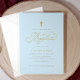 Diese hellblaue Taufinspektion besticht durch elegantes goldenes Drehbuch und ein einfaches Kreuz, das auf den Namen und die Veranstaltungsdetails Ihres Sohnes zugeschnitten ist. Ein zeitloses Design perfekt für eine traditionelle oder moderne Taufe.