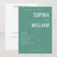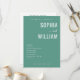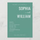 Dieses Hochzeitsprogramm verfügt über ein minimalistisches und elegantes Design mit einem soliden türkisfarbenen Hintergrund, das ein anspruchsvolles und modernes Aussehen schafft. Das Layout ist sauber und organisiert, wobei die Namen in fetter weißer Schrift prominent dargestellt sind und ein kursives "und" einen Hauch von Charme hinzufügt. Die Details zur Zeremonie sind in einer einfachen serifenlosen Schrift aufgeführt, um Klarheit und Lesbarkeit zu gewährleisten. Perfekt für Paare, die eine stilvolle und dennoch unauffällige Ästhetik suchen, gibt dieses Programm den Ton für eine intime und unvergessliche Feier an.