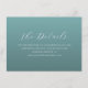 Diese Hochzeitseinlagekarte verfügt über ein minimalistisches und elegantes Design mit einem soliden türkisfarbenen Hintergrund, das eine beruhigende und anspruchsvolle Atmosphäre schafft. Das Layout ist sauber und zentriert und zeigt den Titel "The Details" in einer eleganten Schriftart, gefolgt von prägnanten Informationen in einer einfachen serifenlosen Schrift. Reichlich negativer Raum verbessert die Lesbarkeit, während der anpassbare Website-Platzhalter eine Personalisierung ermöglicht. Perfekt für die stilvolle Übermittlung wichtiger Details, ist diese Karte ideal für formelle Hochzeiten, die einen raffinierten Touch suchen.