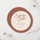 Elegant und dennoch modern mit einer Touch Retro-Glam, bietet diese Wedding Save the Date-Karte einen skallopierten Kreis, die Töne von Terrakotta und Beige und elegante Skriptkalligraphie. Passen Sie dieses Design mit Ihren eigenen Hochzeitsinformationen an.