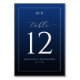 Diese elegante Hochzeitstischkarte verfügt über einen tiefblauen Hintergrund mit knackigem weißen Text, wodurch sie ein anspruchsvolles und zeitloses Aussehen erhält. Das Design ist minimalistisch und zeigt die Zahl "12" in fetter Serif-Typografie als Mittelpunkt, umgeben von sauberen sans-serif-Schriftarten für Namen und Datumsplatzhalter. Der moderne Stil vereint Förmlichkeit mit Zugänglichkeit und ist somit perfekt für die Organisation der Sitzordnung bei Ihrem besonderen Ereignis. Das ausgewogene Layout und die harmonische Farbpalette sorgen für Klarheit und visuelle Attraktivität und sind ideal, um jeder Hochzeitsfeier einen Hauch von Eleganz zu verleihen.