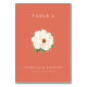 Dies ist ein Bild im minimalistischen Stil mit einer eleganten Tischnummernkarte für "Tisch 2" vor einem warmen korallenroten Hintergrund. In der Mitte befindet sich eine schön illustrierte weiße Pfingstrose mit grünen Blättern, die einen Hauch von natürlichem Charme und Raffinesse verleiht. Die Namen "Isabella & Patrick" sind elegant unter der Blume geschrieben, zusammen mit ihrem besonderen Datum, Samstag, 6. Juni 2026. Es strahlt eine Atmosphäre von verfeinerter Eleganz und freudiger Feier aus, perfekt für die Dekoration einer Hochzeit oder Veranstaltung, um Gäste mit Grazie zu führen.