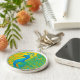 Dieser elegante Schlüsselanhänger für Vogelliebhaber besticht durch seine türkisfarbenen, grünen und blauen Farbtöne auf gemustertem Gelb. Bild generiert mit KI.