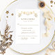 Schöne und elegante RSVP Karte mit Wahlmöglichkeiten. Ähnliches Design ohne Mahlzeiten. Design mit tanzenden Sternen und zartem Rahmen mit Imitaten goldvergoldeten botanischen Garten. Möglichkeit, eine Mahlzeit zu wählen oder für besondere Ernährungsbedürfnisse fragen. Zurück mit der gleichen Garland und Sterne von vorne und "uAwg" in würdevollen Imitaten Gold Kalligraphie. Teil unserer "White and Gold Enchanting and Celestial Collection" mit einer Vielzahl von koordinierenden Produkten einschließlich UAWG-Umschlägen. Die gesamte Sammlung finden Sie unter: https://www.zazzle.com/collections/white_and_gold_enchanting_and_celestial_collection-119073673253835730
